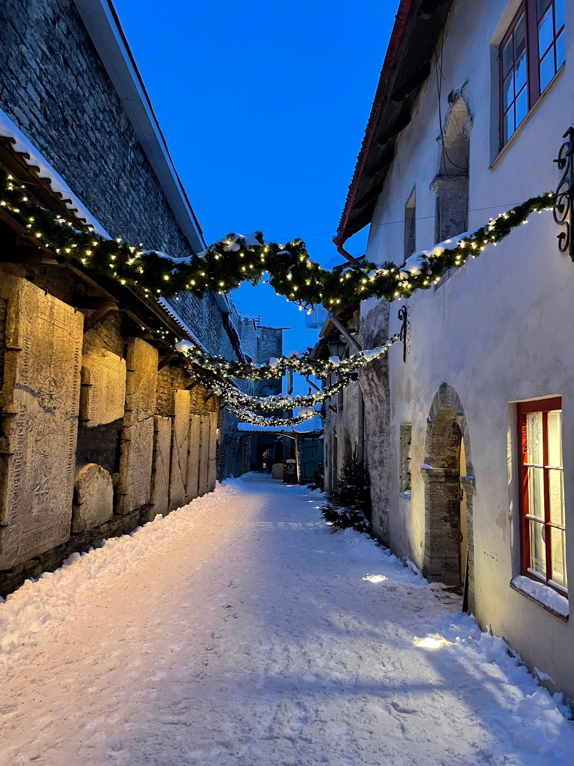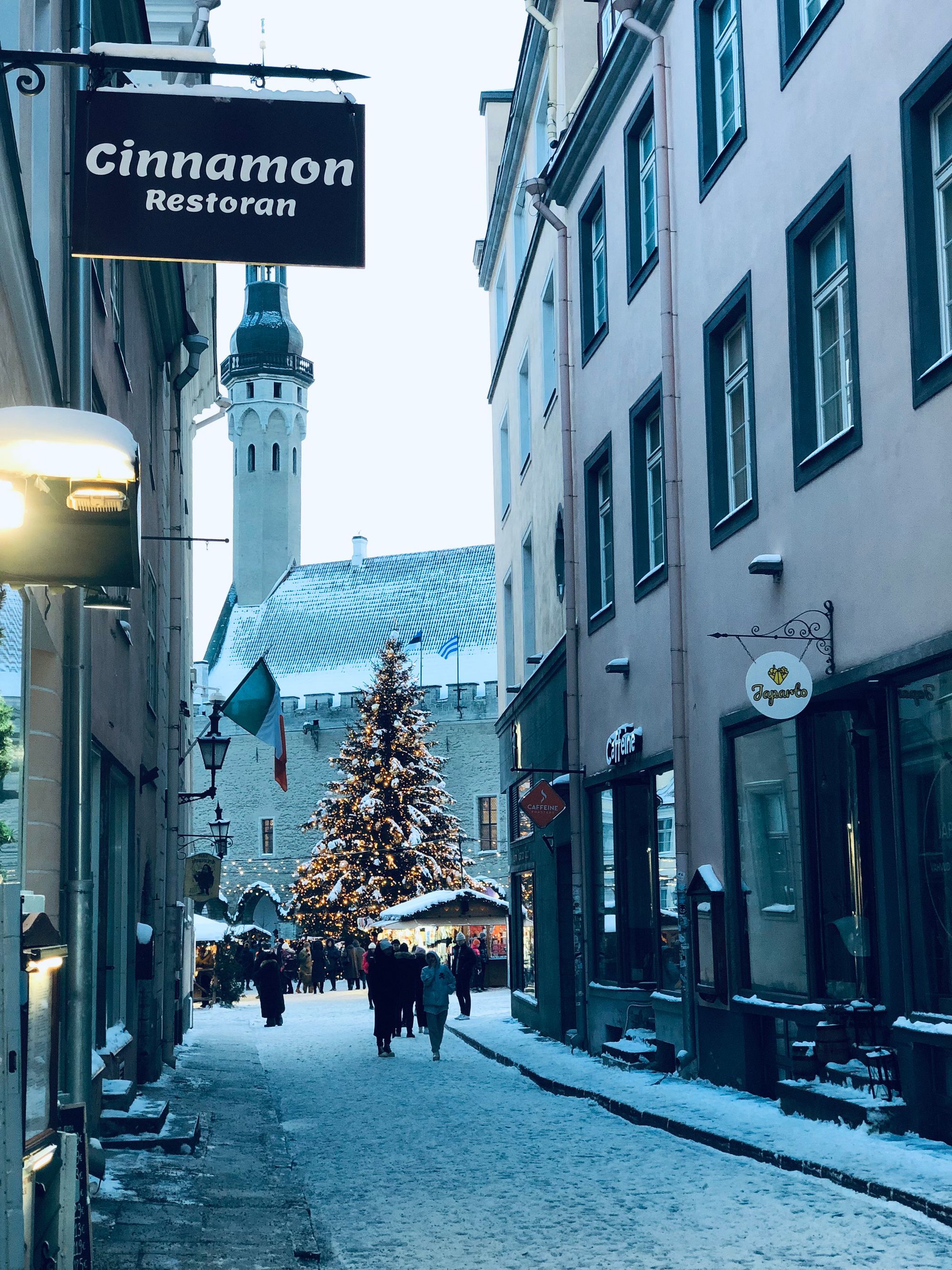 After this tour, we stopped for lunch at 'Nikolay Bar-buffeé', a comfortable place to rest and eat local "sandwiches" with freash fish. It's not up for debate, you absolutely can't leave without visiting "Kadrioru loss", a magnifique Baroque-style palace. It also hosts a museum, the "Kadriorg Art Museum", while my favorite one, the "Kumu", showing Estonian art from the 18th century onwards, is located nearby in the "Kadriorg Park" (it was amazing walking through the park with the snowflakes all over us). For dinner the choice fell on the medieval restaurant 'Olde Hansa' (super cool)! #Anyways we visited the city on foot, as we, well, needless to say, were entranced by the totally unique vibe of the city: the natural color of the sky, the few hours of light, the white mantle of winter snow... the beauty of the scenery left us breathless.
